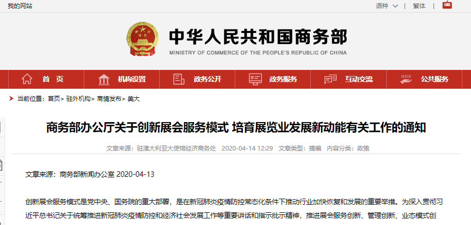 通知原文地址:《关于创新展会服务模式培育展览业发展新动能有关工作的通知》 防疫期间,将线下展会挪到线上进行,已成为破局展览业发展的一剂良方。 4月13日,商务部印发《关于创新展会服务模式培育展览业发展新动能有关工作的通知》。 在加快推进展览业转型升级和创新发展方面,《通知》提出“积极打造线上展会新平台”“促进线上线下办展融合发